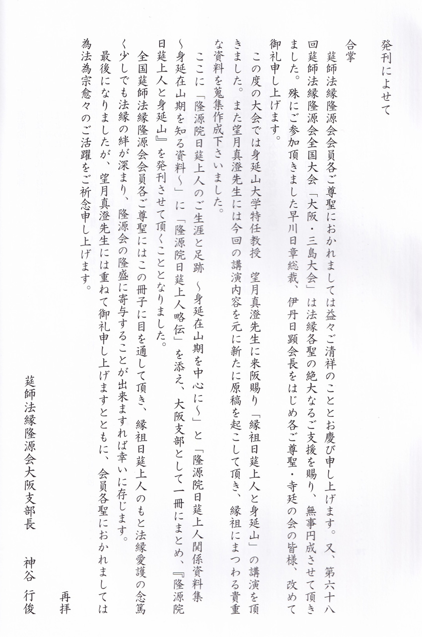令和7年5月28日 シティープラザ大阪で開催された、第68回莚師法縁隆源会全国「大阪・三島大会」にて、記念講演として身延山大学特任教授・望月真澄先生に「縁祖日莚上人と身延山」と題し、約一時間に渡り貴重なお話を賜りました。令和8年1月27日 縁祖第346遠忌ご正当を期して、ここに大阪支部様一丸となって79頁に及ぶカラー刷りA4阪の冊子が発行され、また、この講演の内容をインターネットに掲載し、ご興味のある方々へ拝聴出来るよう、望月先生、並びに主催された隆源会大阪支部様のご承諾を得ることができました。通常のビデオ機で収録しましたので、音声が聞きづらいかと存じますが、どうぞお許し下さい。