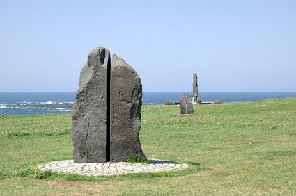 静かな日本海を眺めながら昼食を取り、海岸に下りて散策した。ふと気が付くと、そこには「北緯四十度」と印した男鹿石(安山岩)で造られたモニュメントが建っており、ここは記念撮影のポイントになっていた。