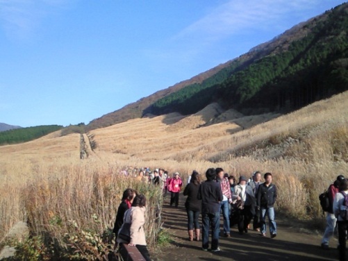 秋になると行って見たいところの一つに「すすき原」がある。そこは、箱根仙石原にあり、遠くから見ると山腹に横帯状に広大なすすきの原が銀色に見える。 「すすき原」に近づいてみると、すすきが一斉に穂をつけ、秋の斜陽を浴びると金色の絨毯を敷いたように一面ヒカリ輝いて見える。まさに圧巻。その素晴らしさにこの句を詠んだ。 この「すすき原」の高原の真ん中には散策路が設けられており、中に進むとすすきの穂に囲まれた大草原の中を散策しているような気持ちになる。 そして、中程、人の背丈より高いすすきの群生の中に身を置くと、すすきのみが揺れてまさに大自然に抱かれたように、心安らぐ気持ちになる。 ここは仲間と度々訪れた地である。