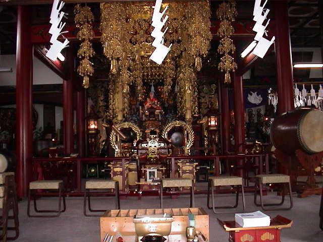 お寺の中心に位置し、ご本尊を祭ってあるお堂。堂内は内陣と外陣に区別され、内陣はご本尊を安置し、荘厳具を布置、僧侶が法要を営む堂内中央の部位であり、外陣は参詣僧俗の席となっている。
